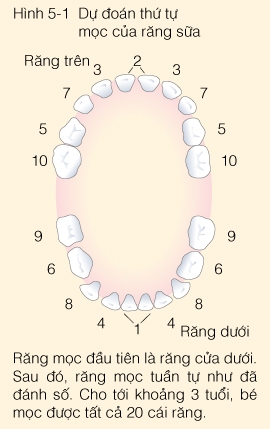Răng sữa có tổng số 20 chiếc. Răng cửa mọc trước khi trẻ được 1 năm tuổi nhưng răng hàm, loại răng có thể nhai được thức ăn, lại chỉ mọc đủ sau khi trẻ được hai tuổi rưỡi. Trước khi trẻ mọc đủ răng, bạn hãy cho trẻ ăn chủ yếu các món mềm hơn so với thức ăn người lớn, thỉnh thoảng cho trẻ thức ăn cứng để bé tập nhai.